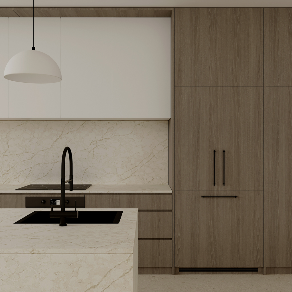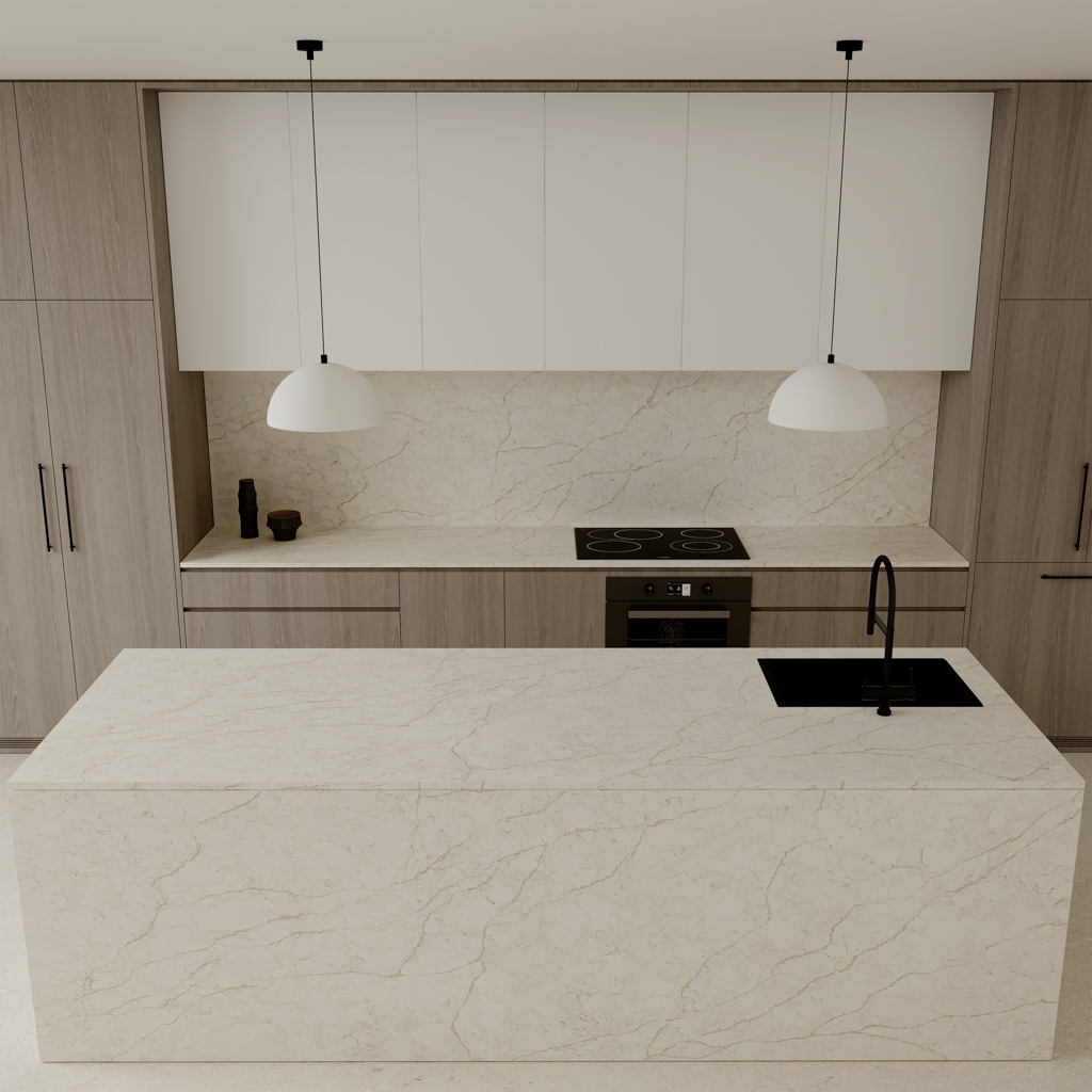 Its neutral and elegant palette allows it to harmonize seamlessly with timber cabinetry, metallic fixtures, and a wide variety of interior colour schemes.