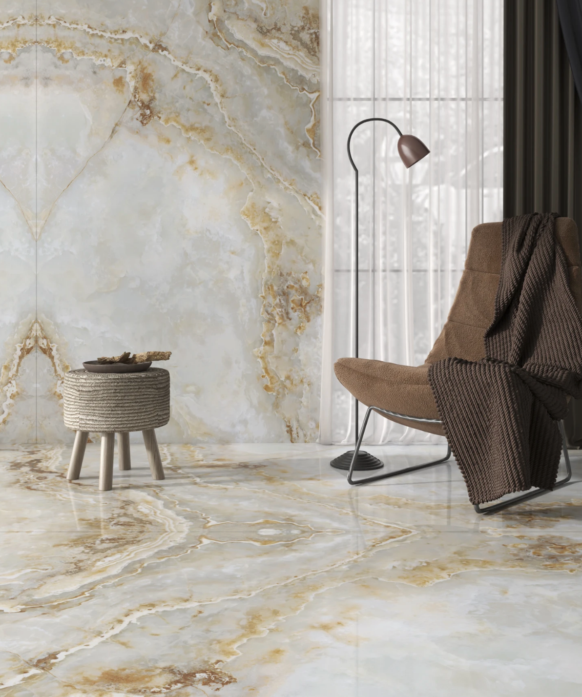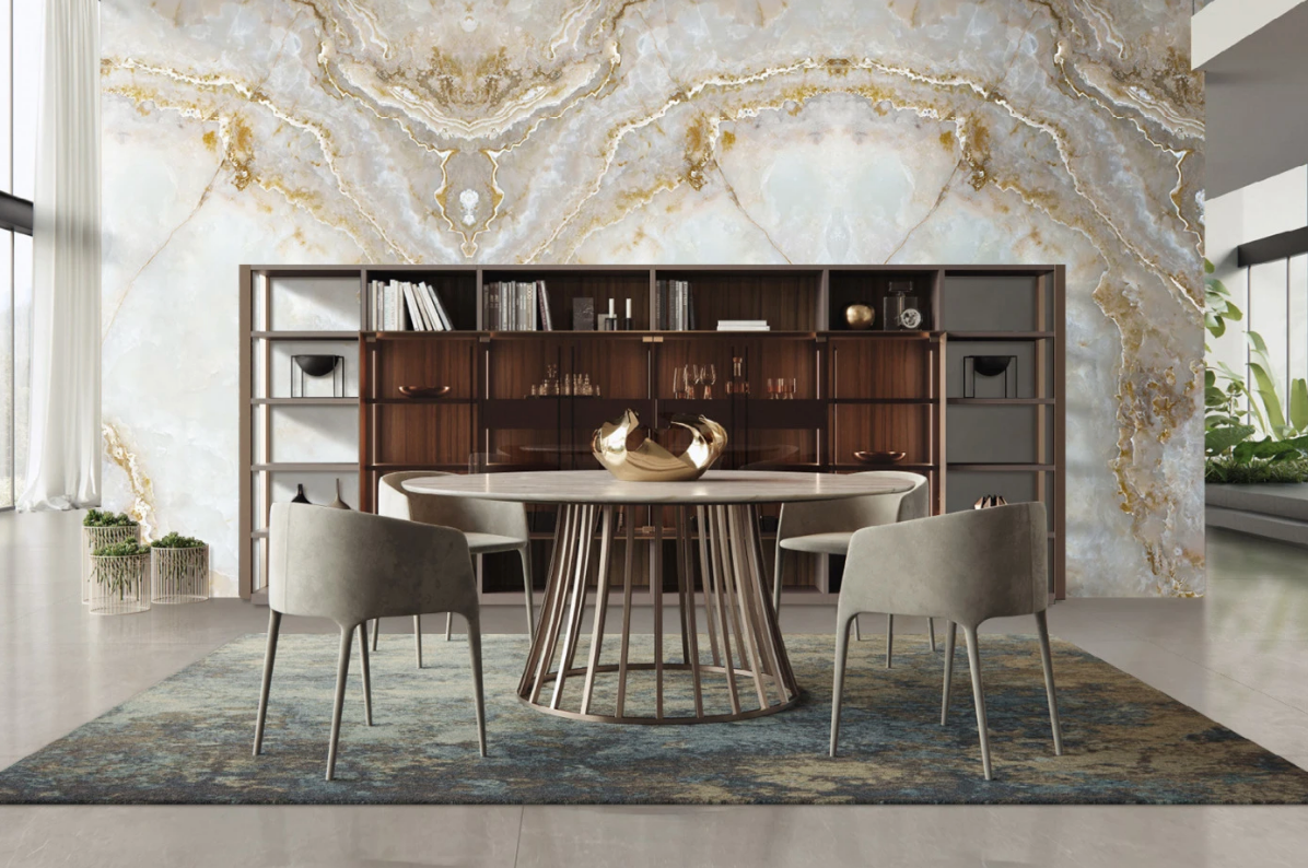 AC2053 Empira Onyx AC Stone glossy porcelain feature wall with book match pattern in luxury interior