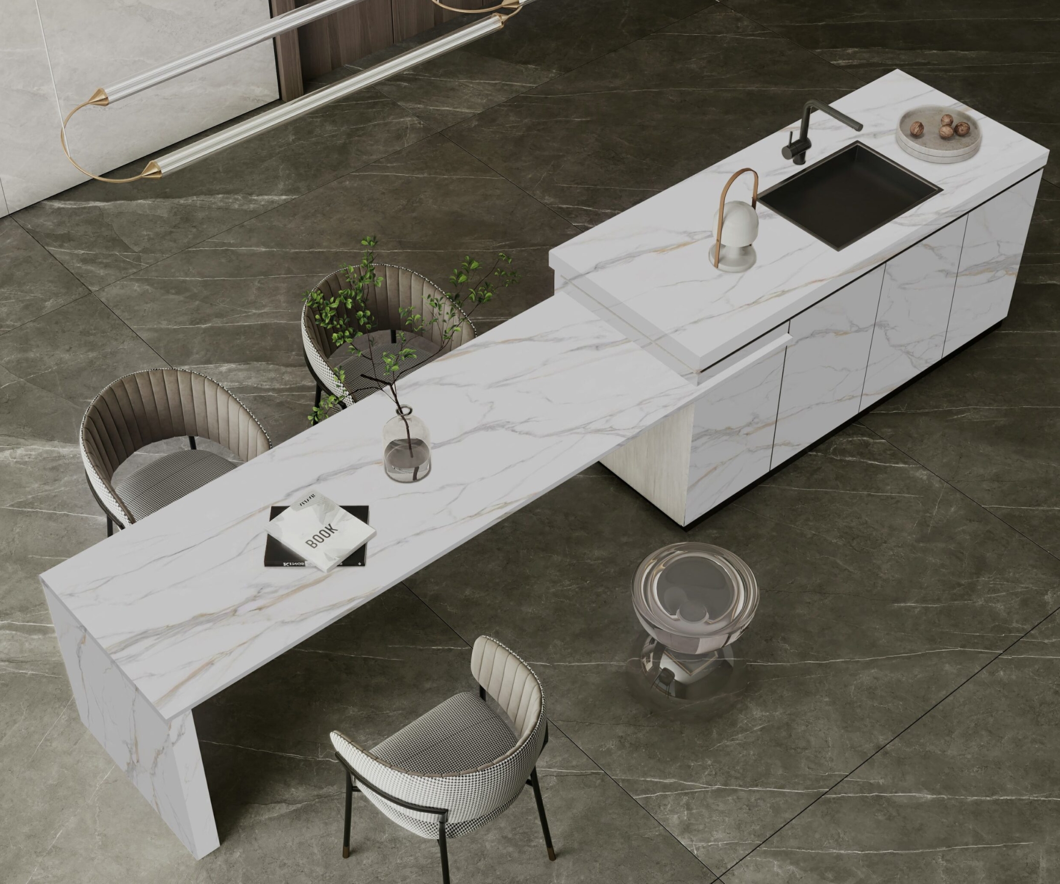 Porcelain is a strong, durable and heat resistant surface which can be used for both outdoor and indoor needs. Whilst emulating the look and feel of marble closely, Porcelain has added practicality, including being easy to maintain, and withstanding outdoor weathering.