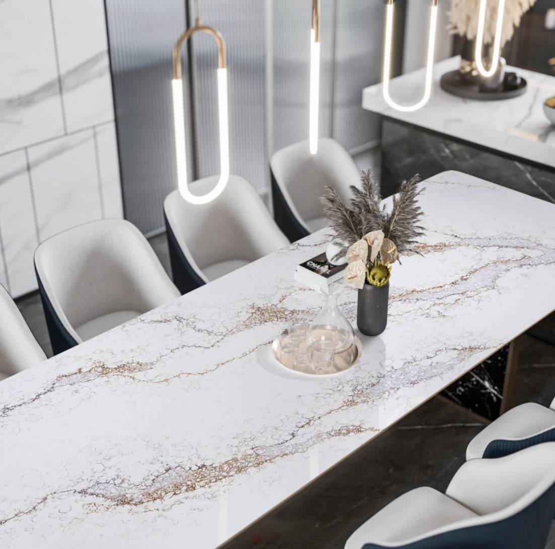 Bask in the warm tones of AC Stone Sunset, a striking mineral stone that combines natural sophistication with exceptional durability. Featuring a crisp white base interlaced with soft, earthy veins, this timeless design brings effortless warmth and character to any space. AC Stone Sunset veining patterns flow gracefully across its surface, adding depth and texture without overwhelming your design. Its neutral tones create the perfect foundation for classic or contemporary interiors.