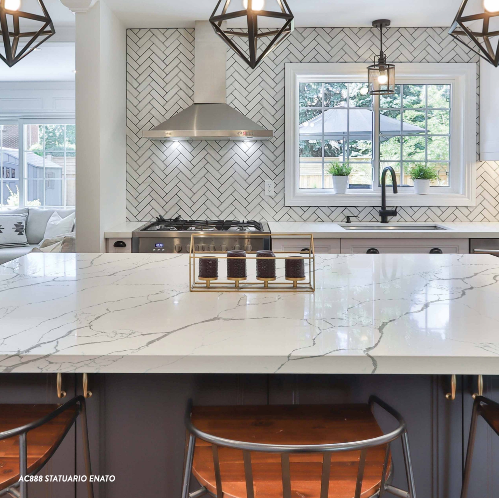 AC Stone Statuario Enato is a white base with brown-grey thin veining cascading diagonally throughout the piece. This piece has a subtle mix of long and webbed veining, which ensures there is a good mix of design in every piece of the stone. AC Stone Statuario Enato pairs well with many different interiors, particularly dark timber or black cabinetry.