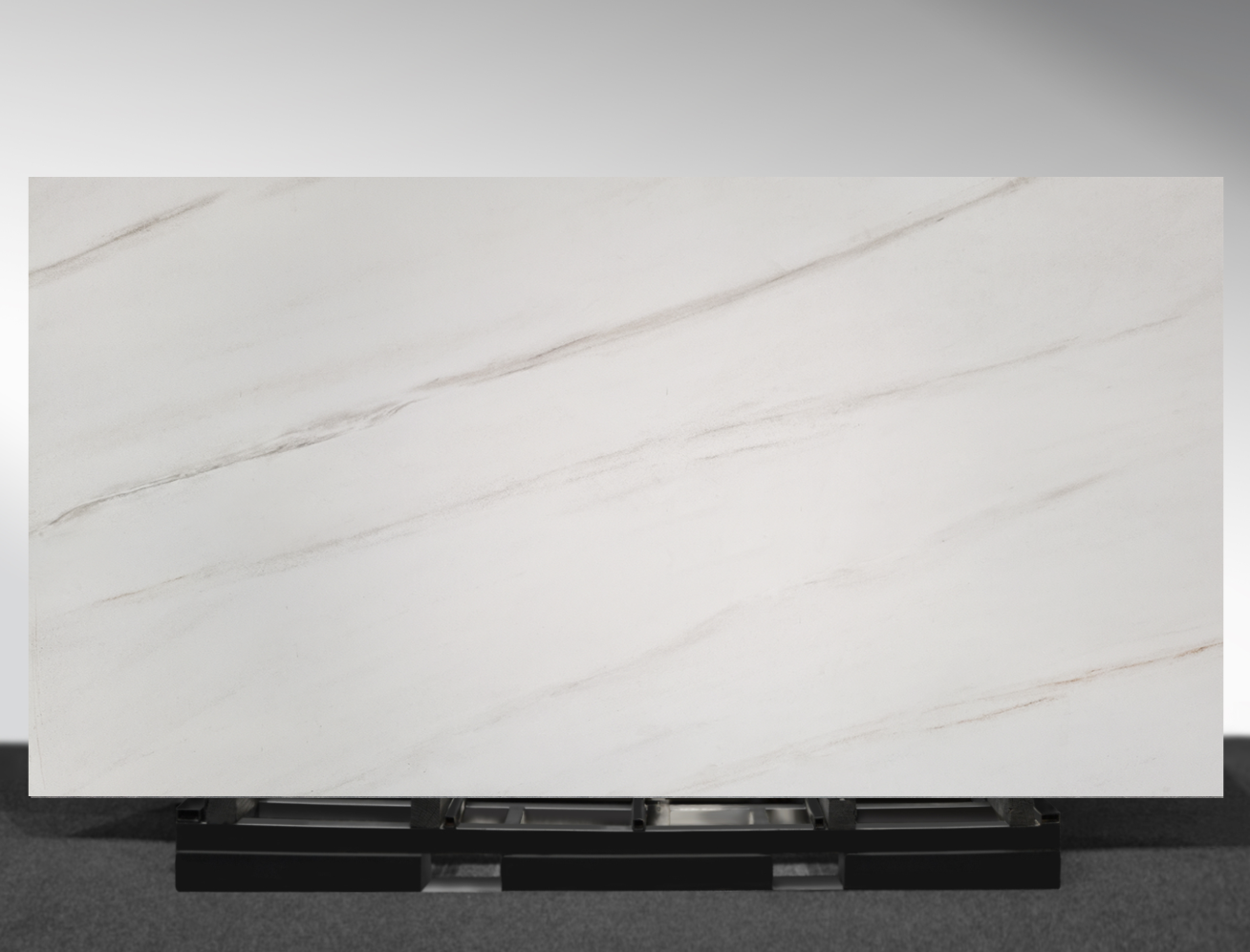 Bianco Lasa from the AUSKstone Master Sintered Stone Collection features a bright crystalline white base with soft grey and warm beige veining, inspired by classic Italian marble. Its elegant and refined pattern creates a luxurious yet timeless aesthetic, making it suitable for both contemporary and traditional interior designs.