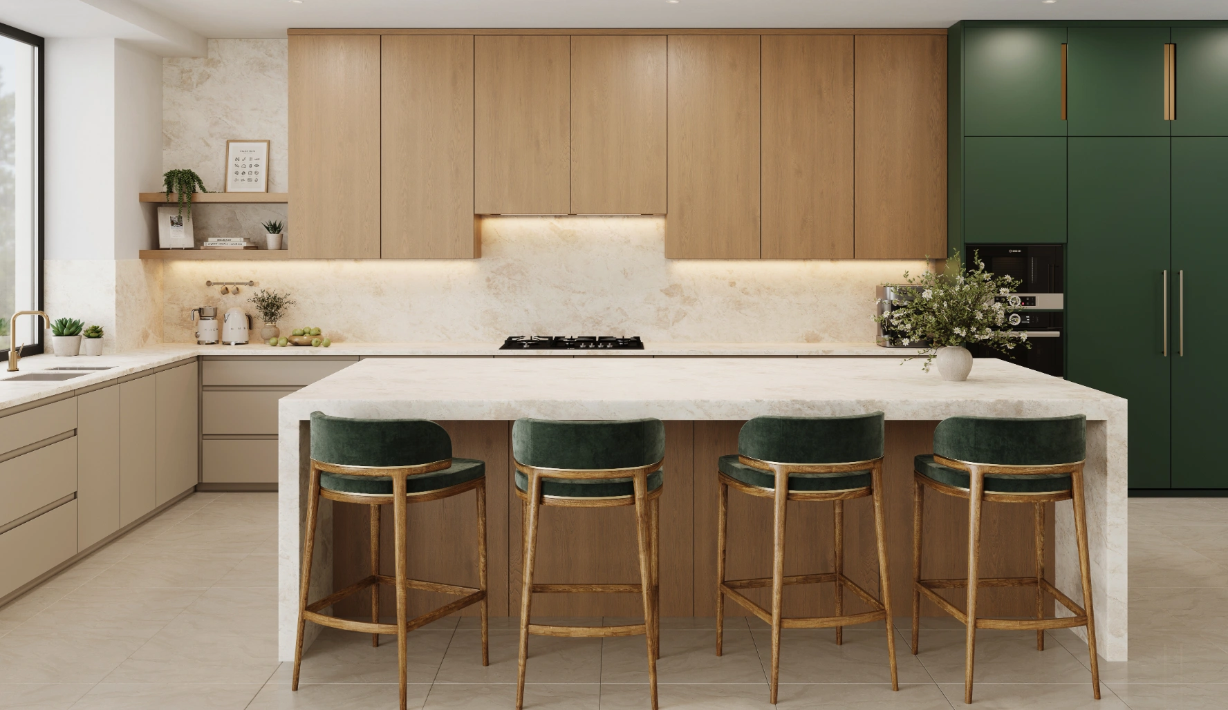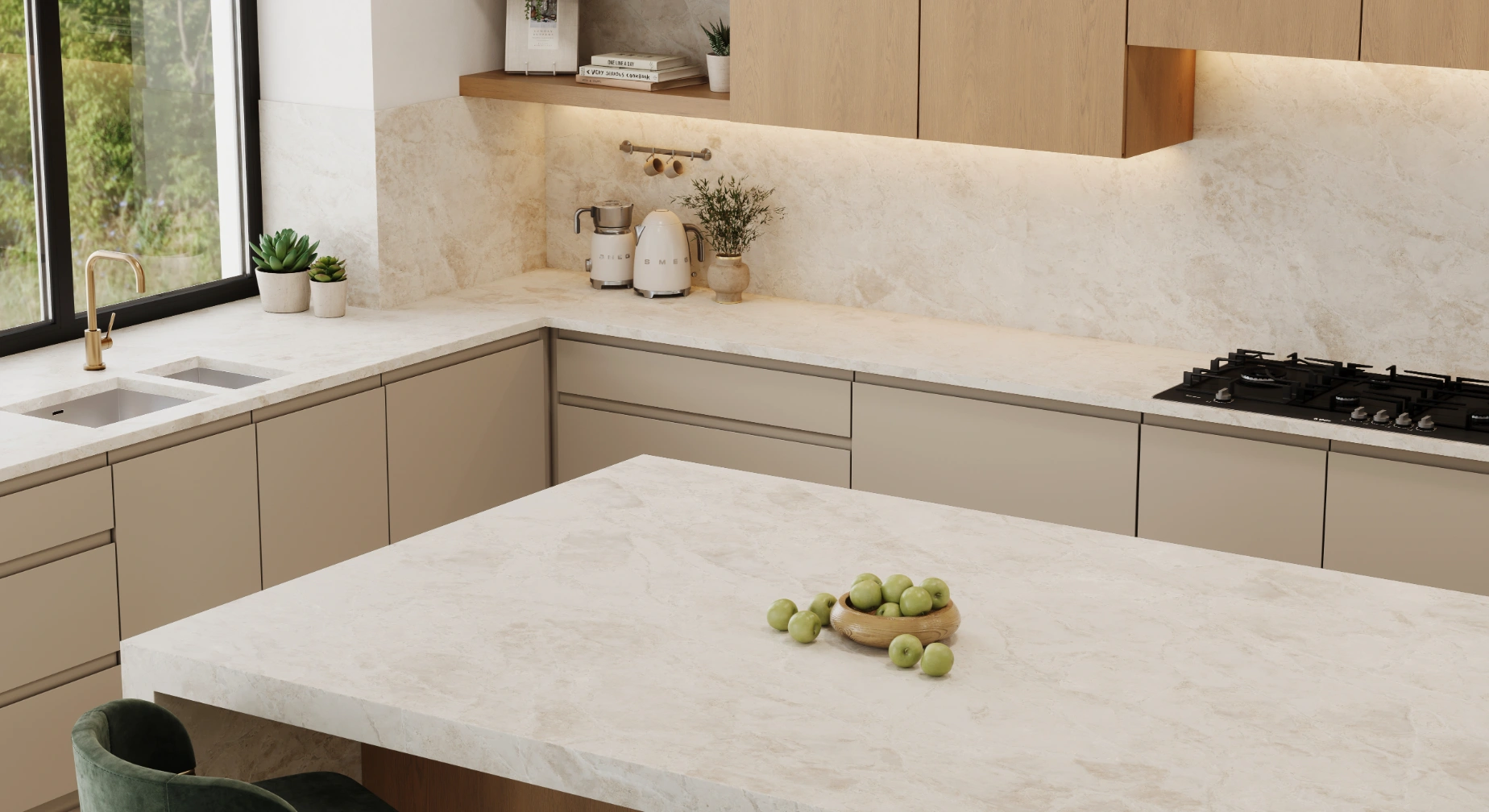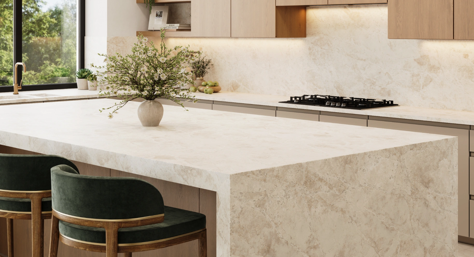 Enhance your design with a surface that combines quiet movement, natural warmth, and enduring style — Braewind – a refined and calming quartz surface from the Vadara® collection by AUSKstone Engineered Stone.