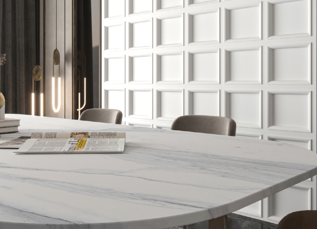 Calacatta Cascade evoking the luxurious beauty of Italian Calacatta marble, these panels cascade with a pristine white backdrop accented by flowing veins of soft grey, reminiscent of the elegant waterfalls adorning the marble’s surface.