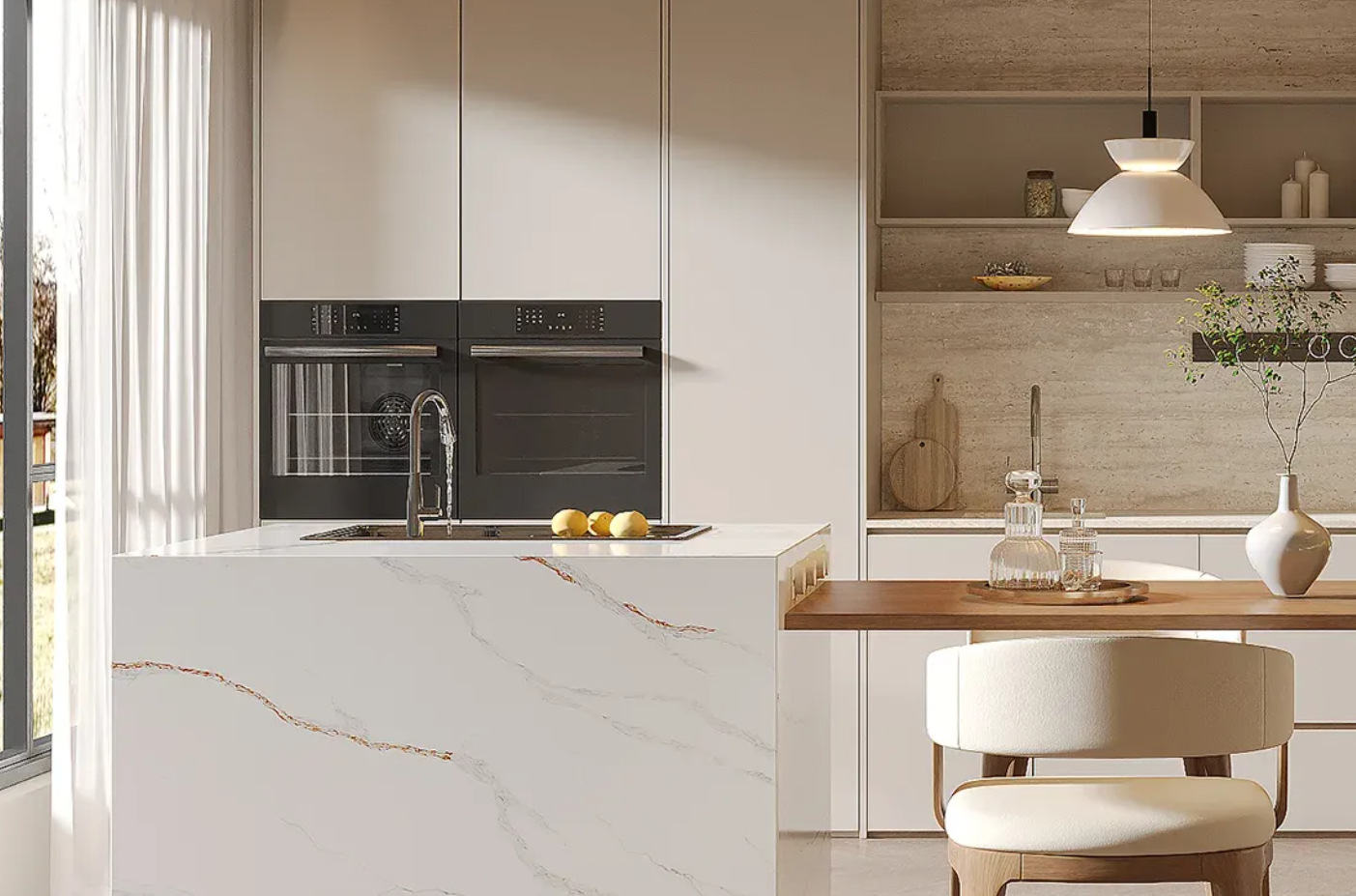 Calacatta Fusion (CSF6769) from AUSKstone’s Prestige Plus Range features a soft white base accented with silken grey veins and streaks of molten copper. The dramatic, fused pattern evokes energy and movement, blending classical elegance with bold, contemporary flair.