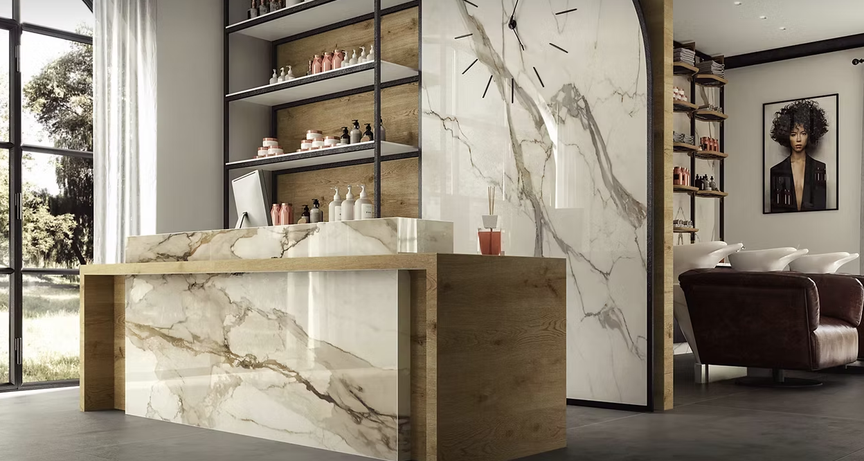 The Calacatta Imperiale Marble Look Porcelain Slab embodies the elegance of classic Italian marble, reinterpreted through advanced porcelain technology. Designed by Tech Oceania, this slab features a luminous white background enhanced by graceful, flowing veining that adds depth and movement to any space.