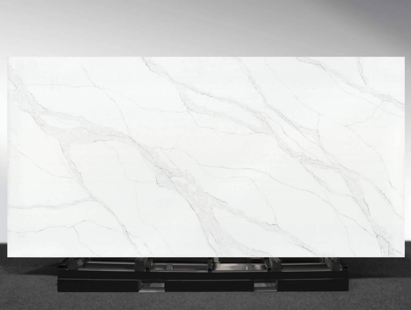 Escala Vadara® Quartz engineered stone slab with white base and bold taupe and blue veining