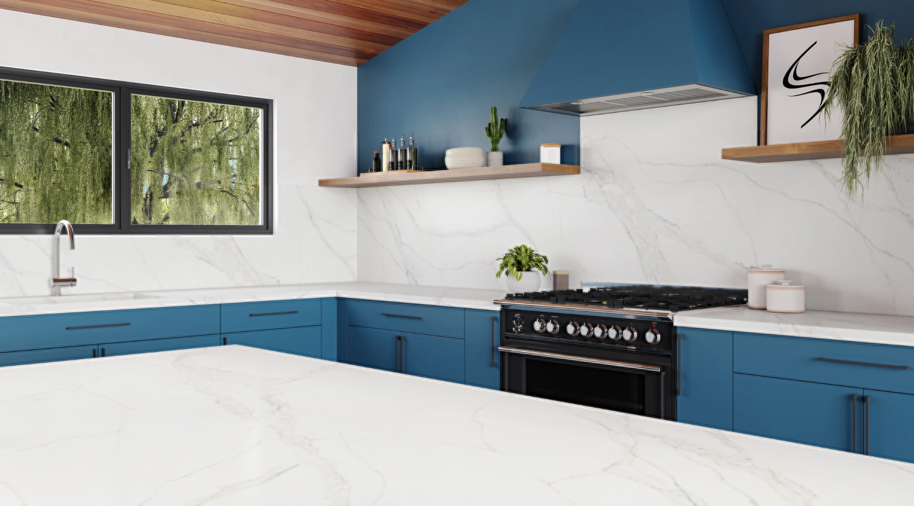Escala from the Vadara® Quartz collection by AUSKstone Engineered Stone is a premium engineered quartz surface inspired by classic marble elegance. This design features a bright white background with bold, dynamic taupe and blue veining, creating a striking visual contrast that brings depth, movement, and refined character to interior spaces.