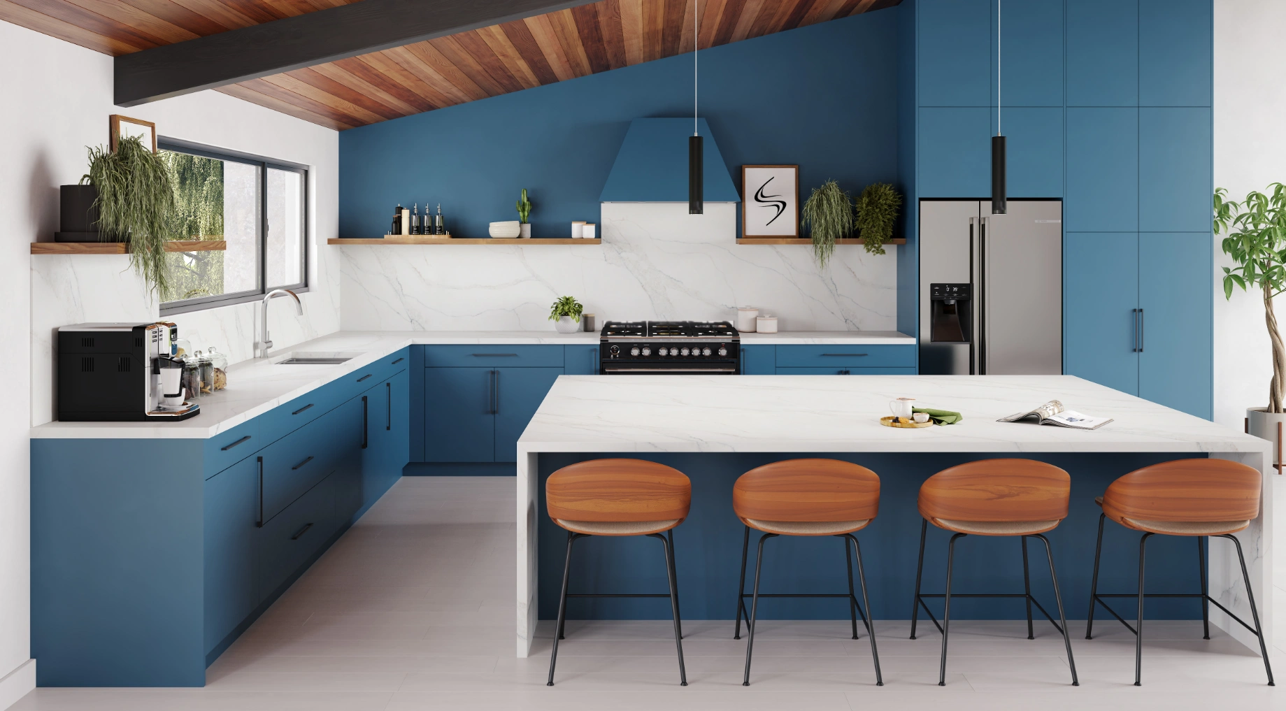 The dramatic interplay of warm taupe and cool blue tones gives Escala a versatile aesthetic that complements both modern and timeless design styles. Its expressive pattern adds visual interest and sophistication, making it an excellent choice for feature benchtops, waterfall islands, and statement wall surfaces.