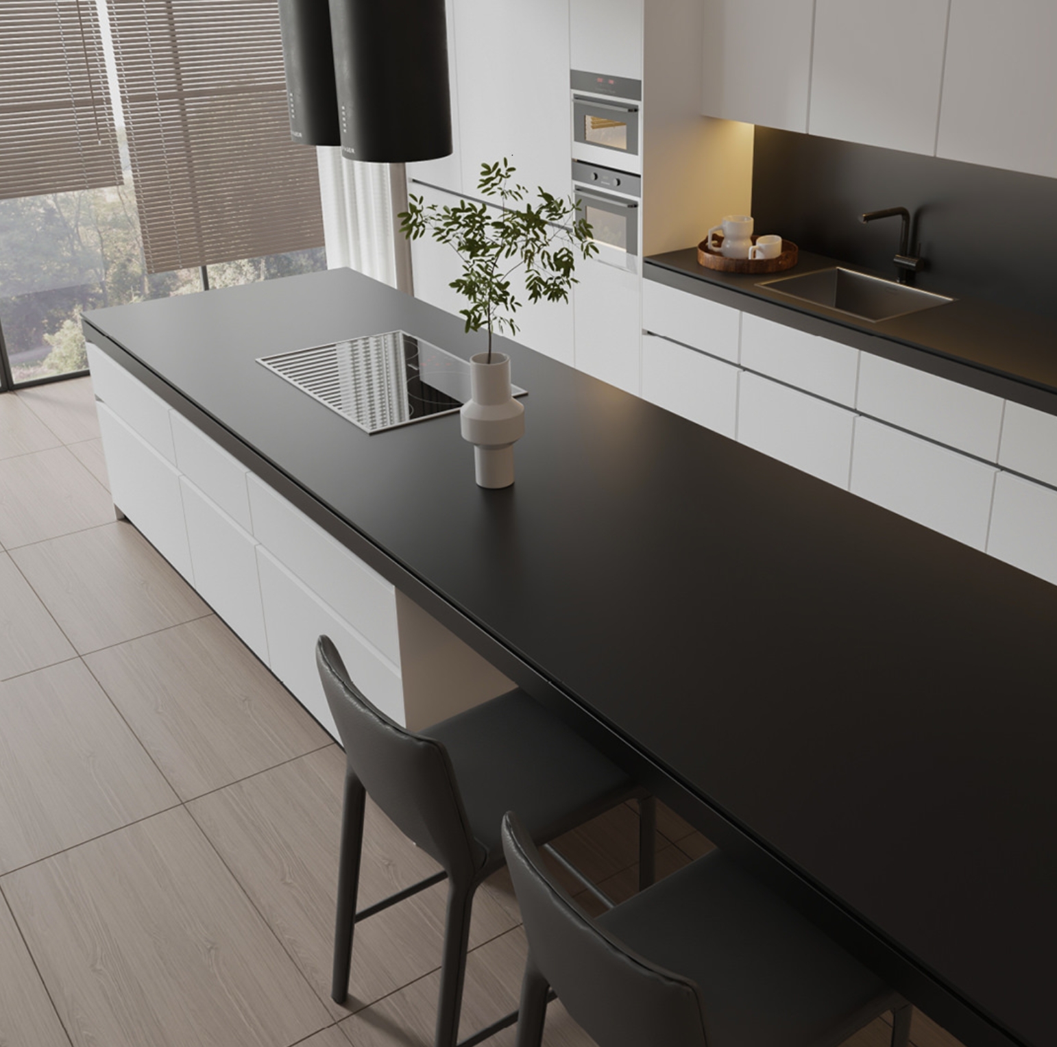 Nero Puro Suede from Smartstone’s Sintered Collection is available at AUSKstone Sydney. A deep black suede-finish sintered surface offering exceptional durability, heat resistance and modern sophistication—ideal for kitchen benchtops, splashbacks and contemporary interior projects.