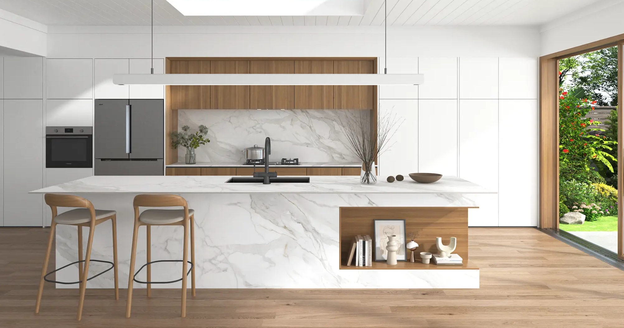 Ombre features a luminous pearl-white base, delicately veined with dark grey crackling patterns that add depth and sophistication. This 12mm Vasari porcelain surface is non-porous, heat-resistant, and highly durable—ideal for kitchen benchtops, bathroom vanities, splashbacks, and feature walls. Its soft finish enhances the elegance of any space while providing low-maintenance practicality.