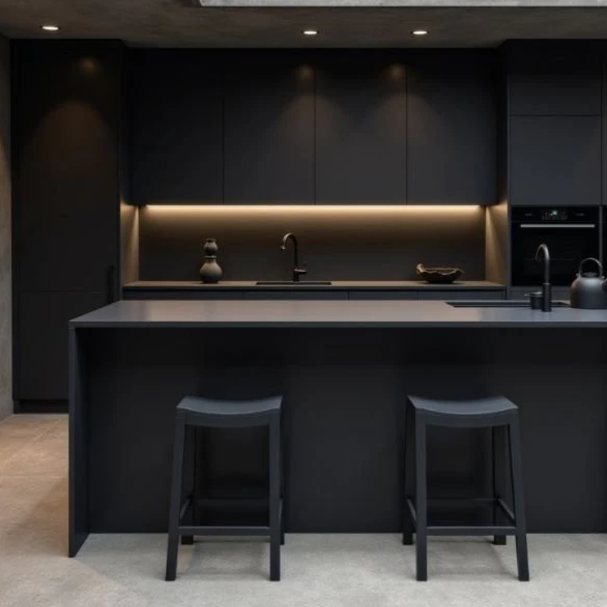 The matte finish reduces glare while enhancing the richness of the black surface, making it a strong choice for high-end interiors that demand both durability and visual impact.