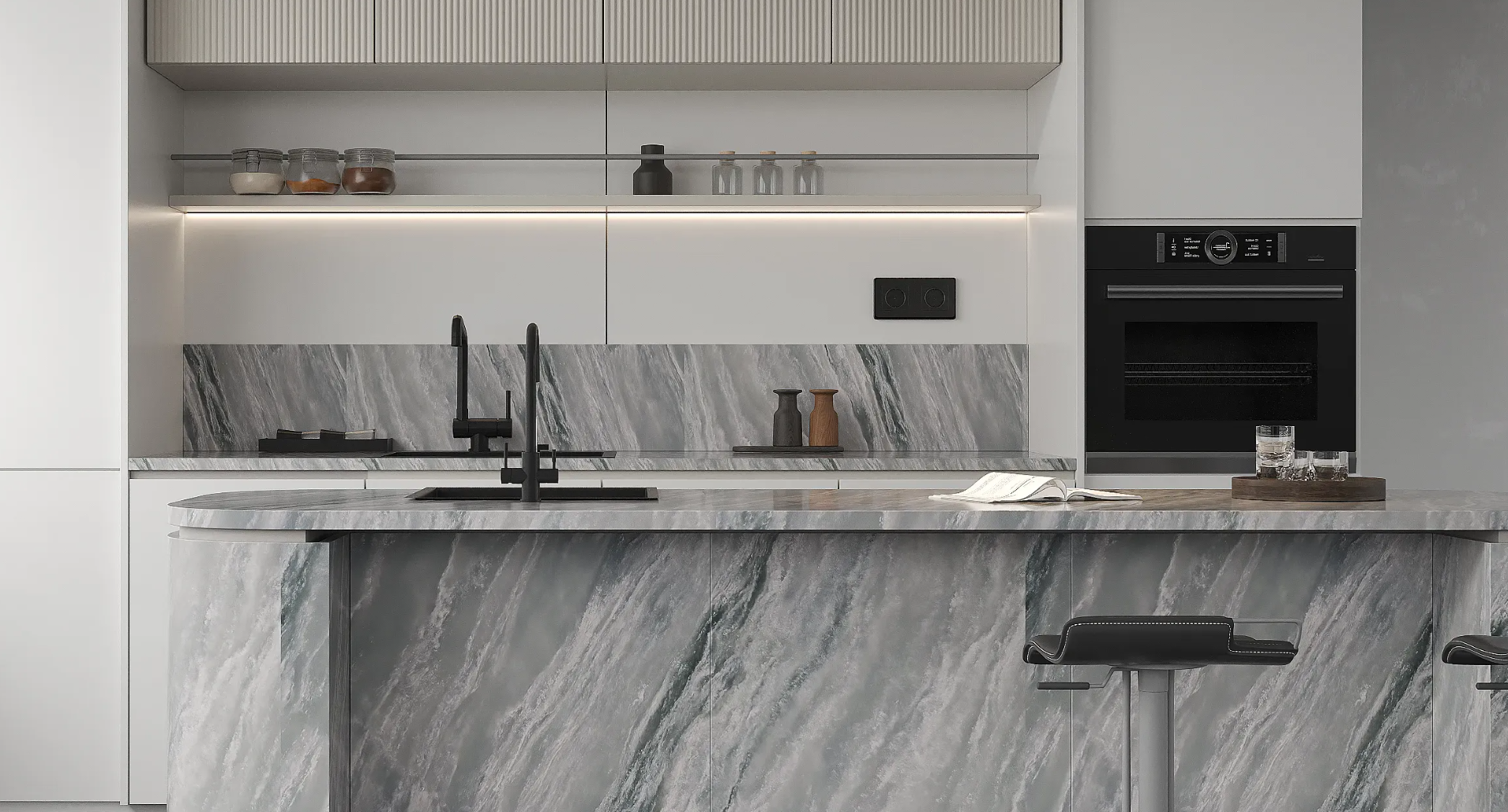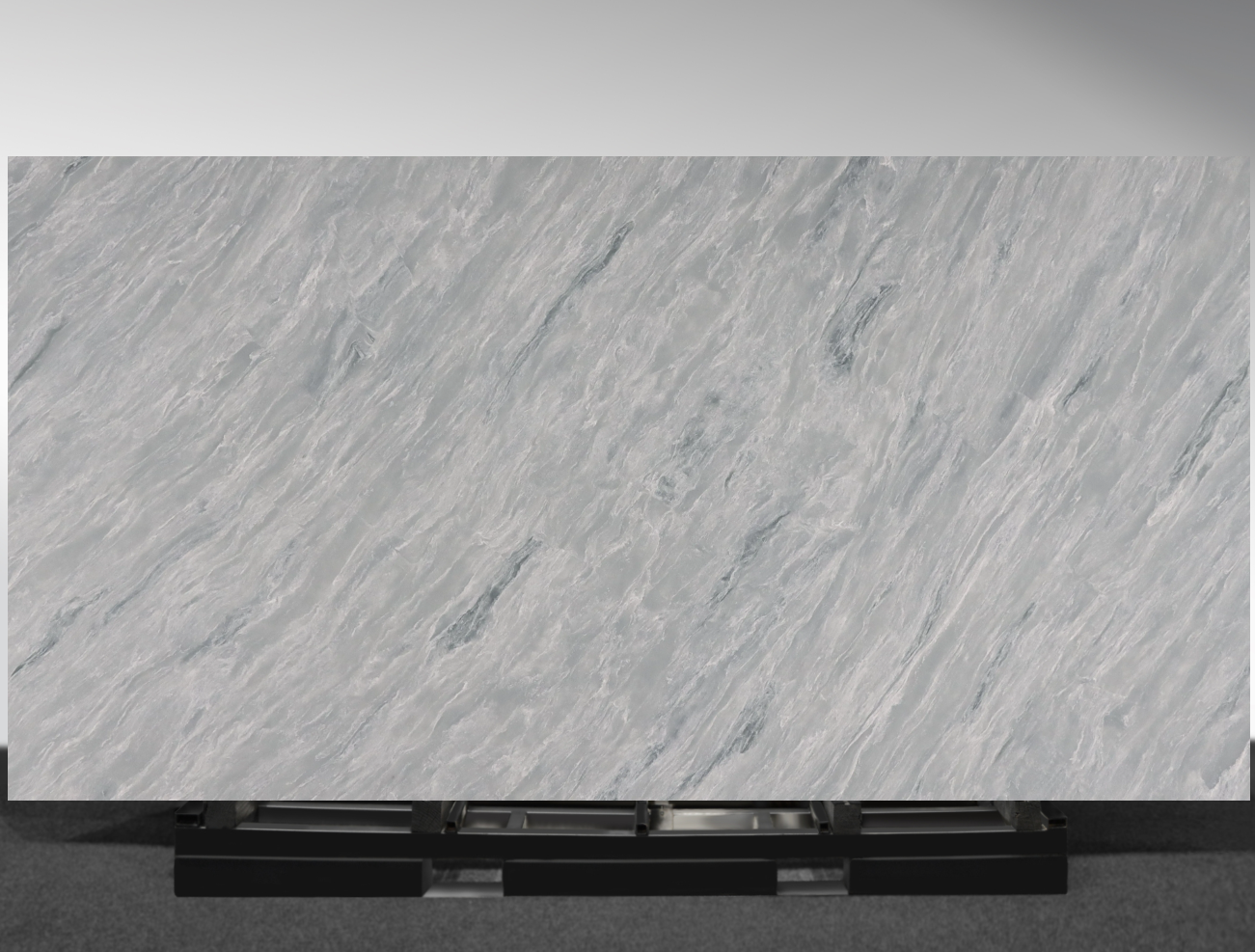 Quartzite Laguna (CSF7133) from AUSKstone’s Prestige Plus Range evokes the fluidity of water frozen in stone. Smoky blues and silvers sweep across a polished, translucent surface, creating depth, movement, and visual rhythm. Its tactile, bookmatched design enhances symmetry while highlighting the slab’s natural flow.