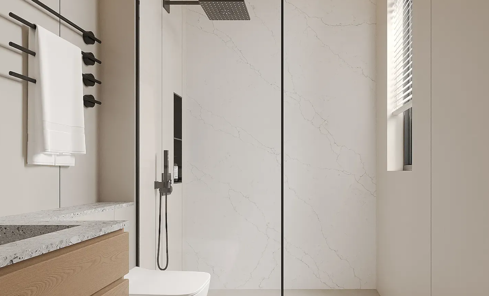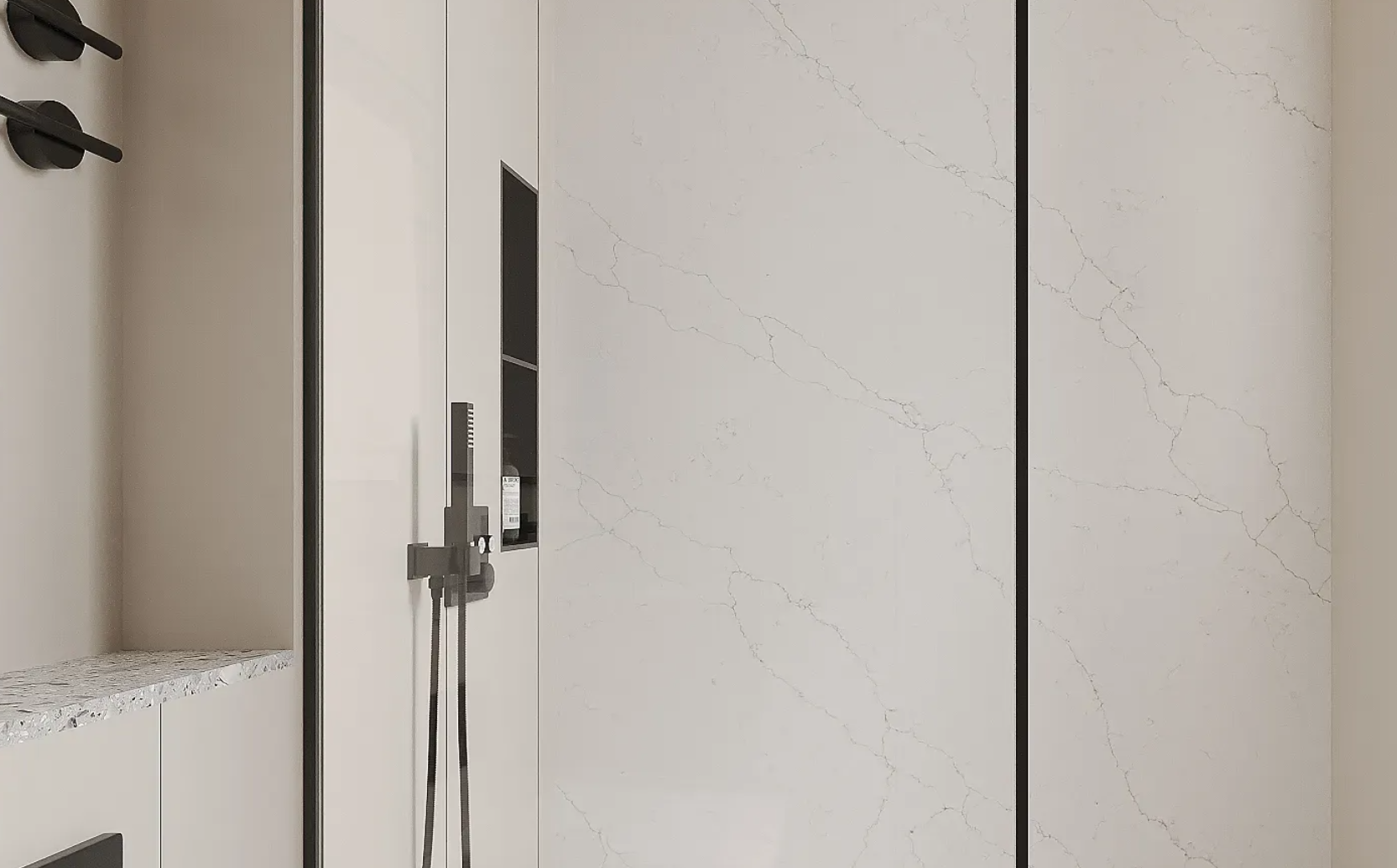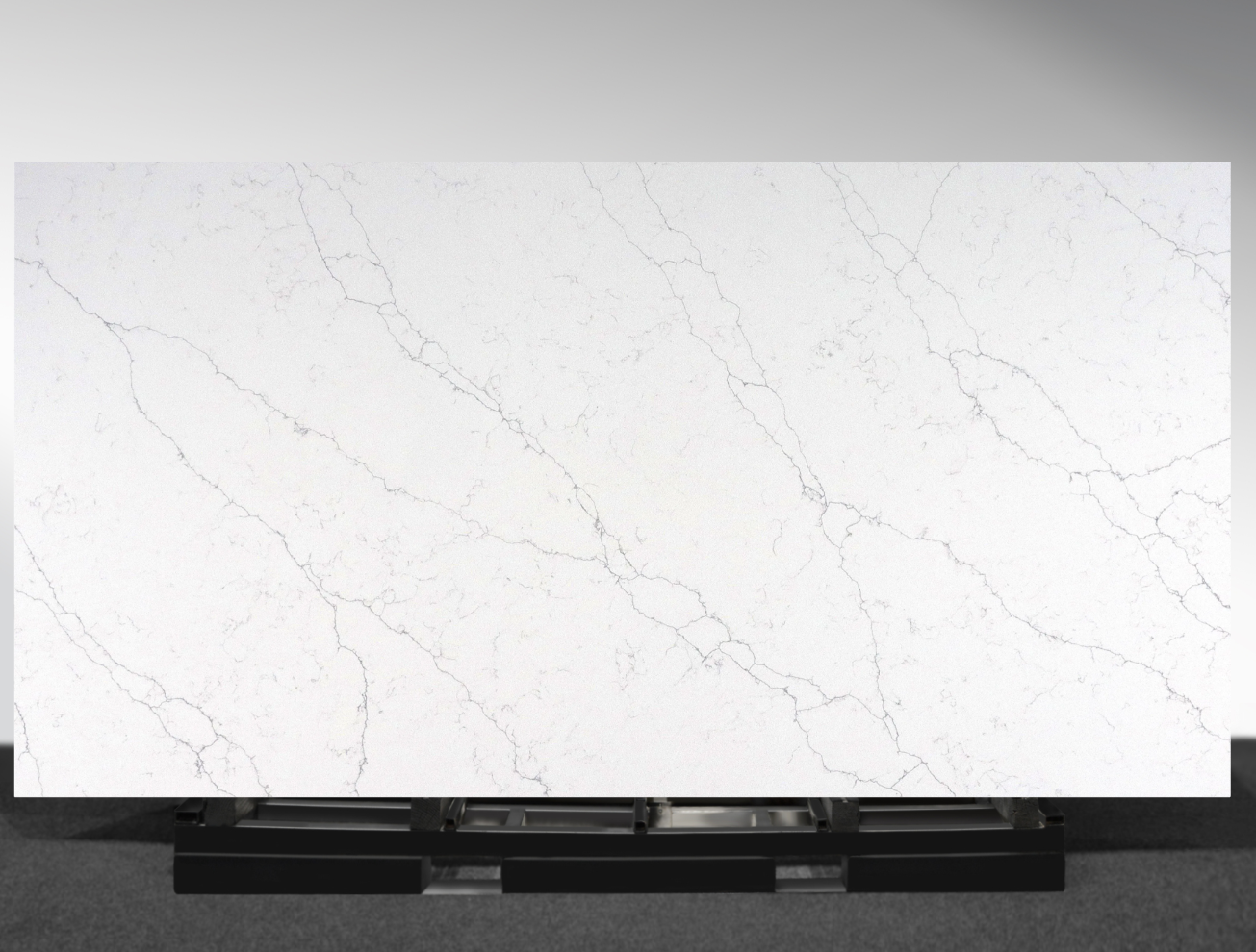 Snowline (CSF6859) from AUSKstone’s Prestige Range offers a soft white base accented with faint grey mineral lines, evoking the subtle elegance of silk draped over stone. Its gentle, continuous veining provides texture without distraction, creating a calm, composed aesthetic.