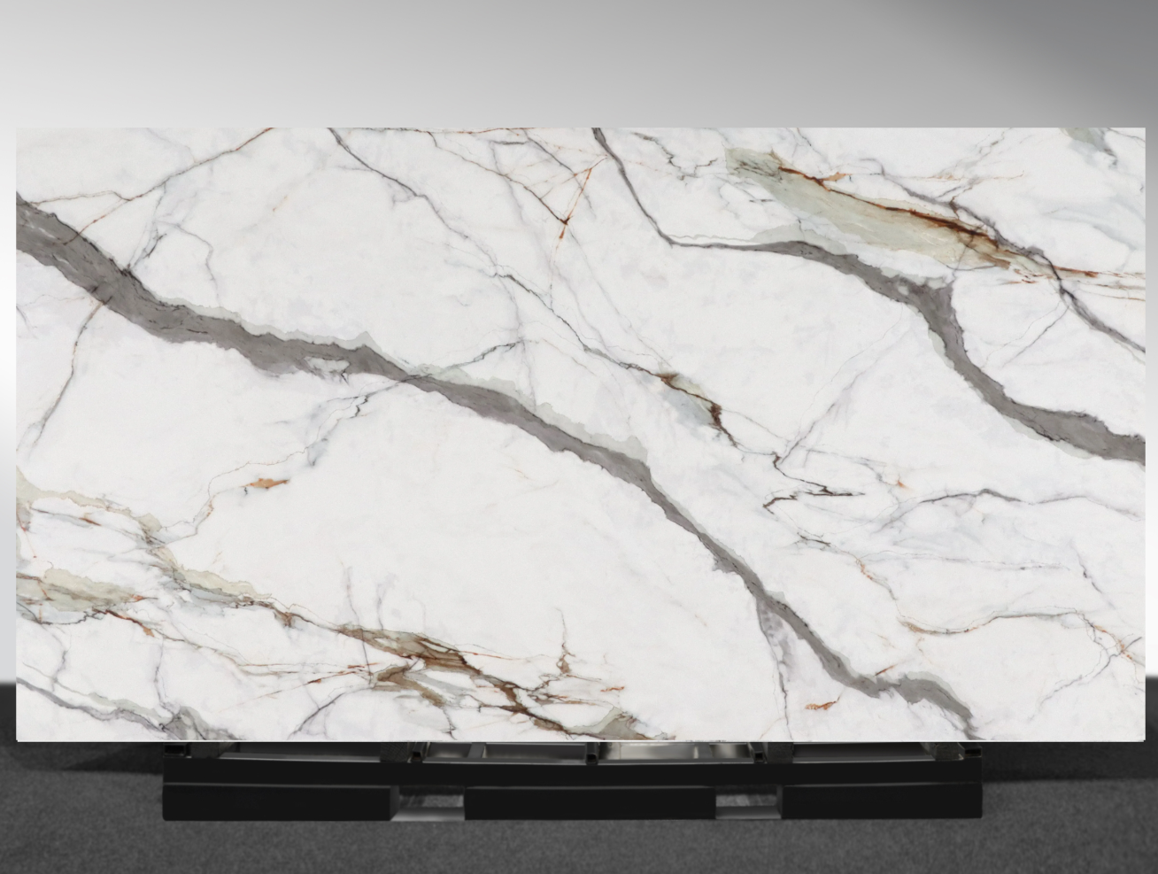 Strata Viva (CSF9074) from AUSKstone’s Luxury Range features bold graphite veins interacting with translucent layers of olive, rust, and bone-white, creating a dynamic, living surface. The printed marble-effect design evokes the energy of geological forces in motion, balancing structure with organic tension.
