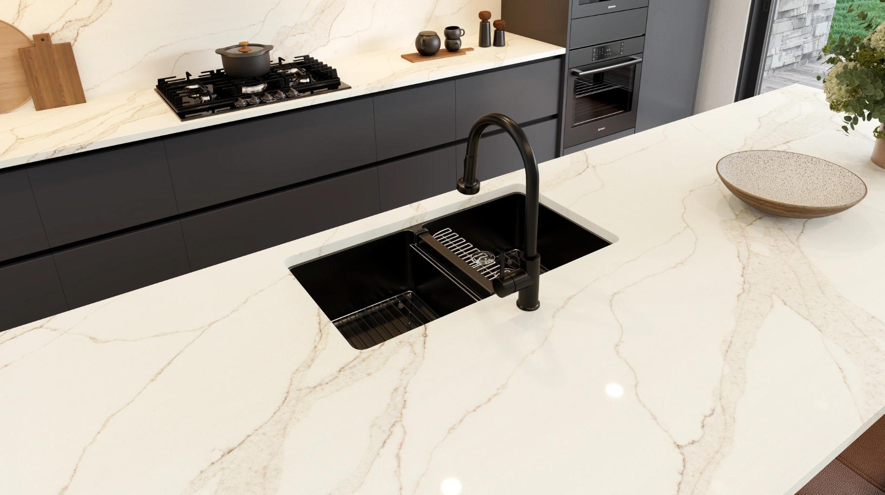 Kitchen benchtop featuring Sunsweeper Vadara® Quartz surface by AUSKstone