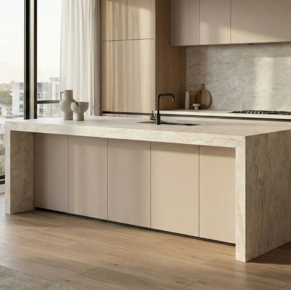 Designed for luxury kitchen benchtops, island benches, bathroom vanities, splashbacks, and feature surfaces, Taj Mahal Royal is especially popular in premium coastal-inspired homes across Sydney, Melbourne, and Perth.