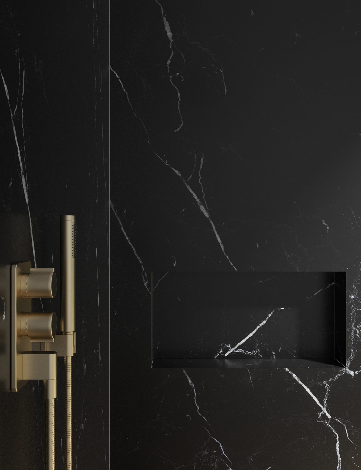 Uncover our exquisite Vena Marquina porcelain, infused with arbitrary, vivid white veins, creating a striking and elegant modern aesthetic.