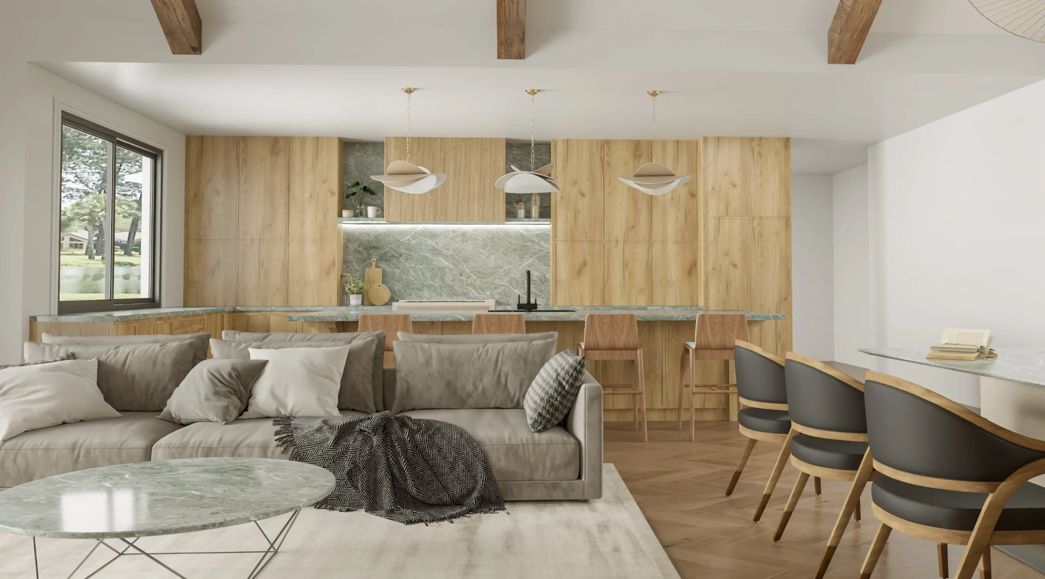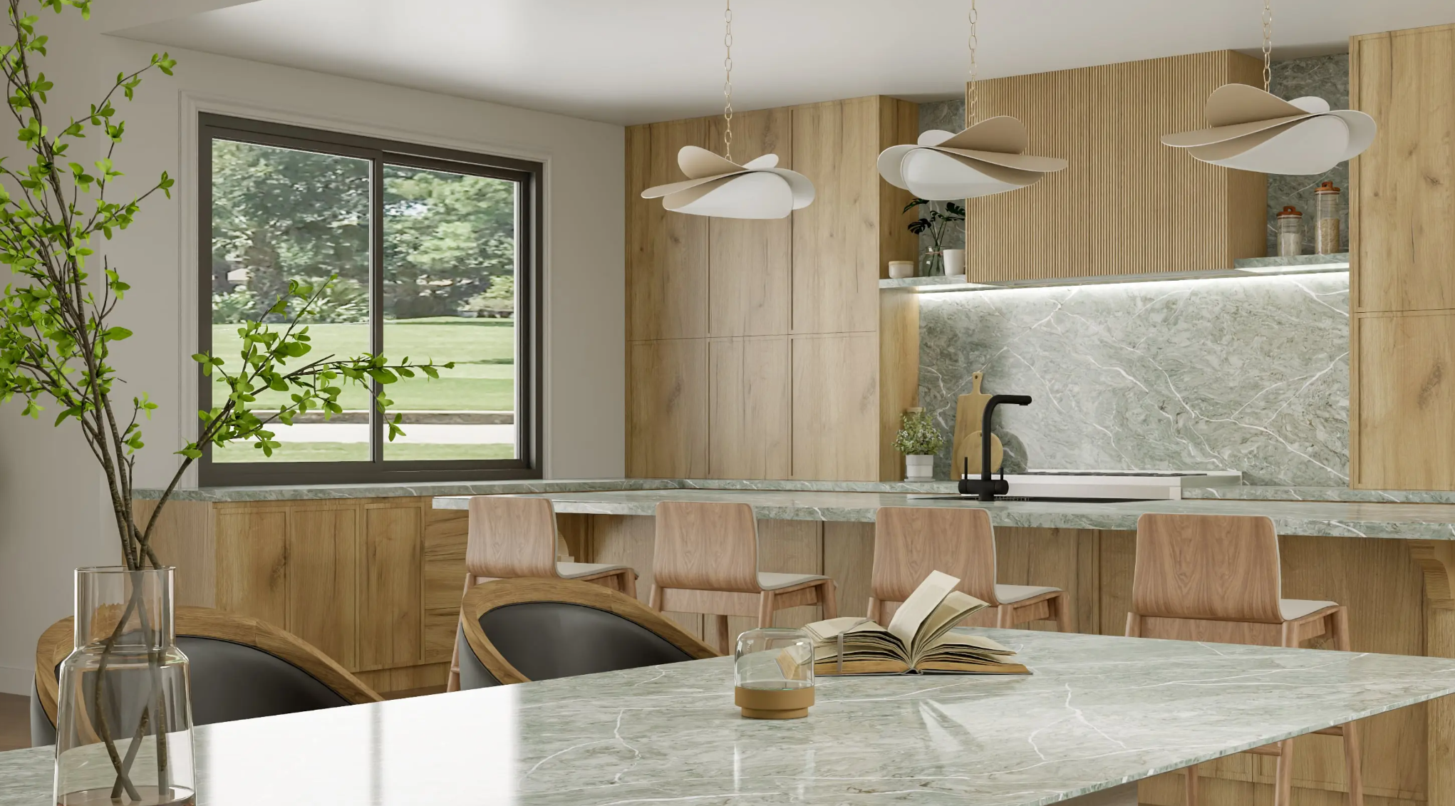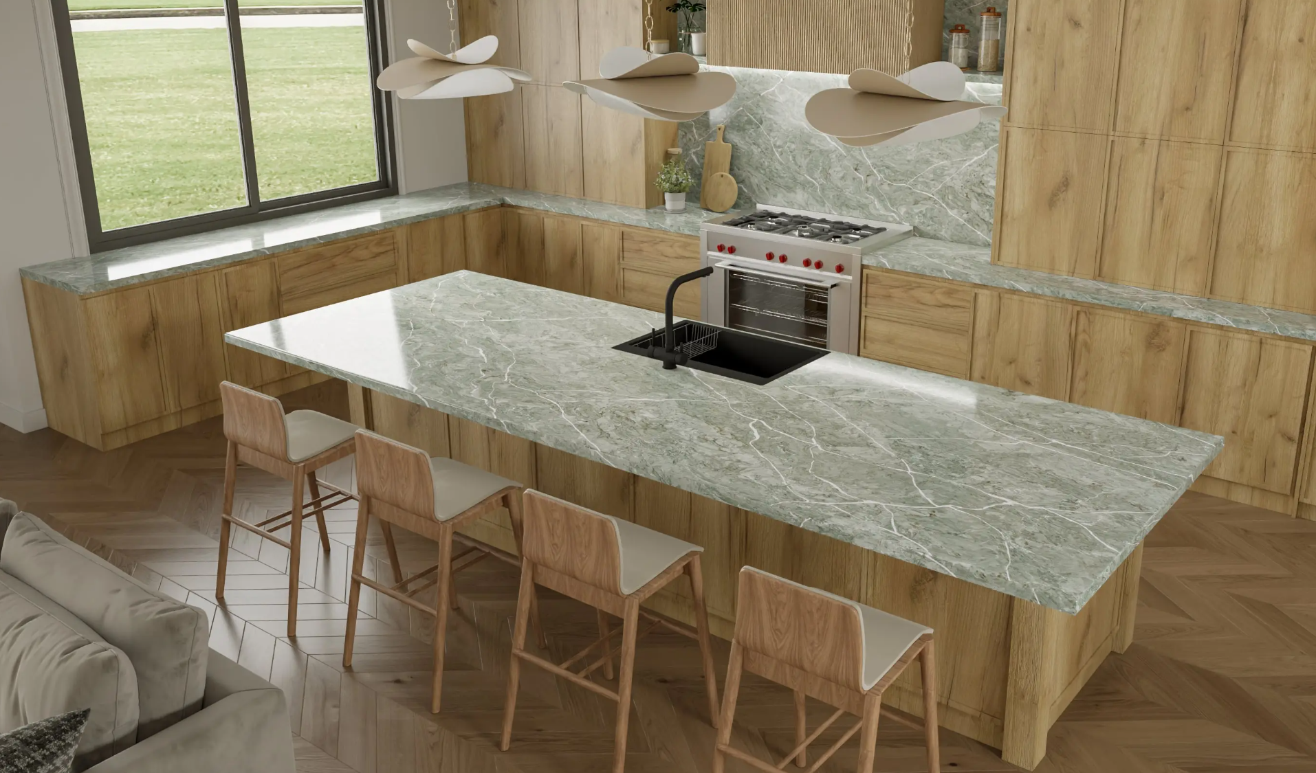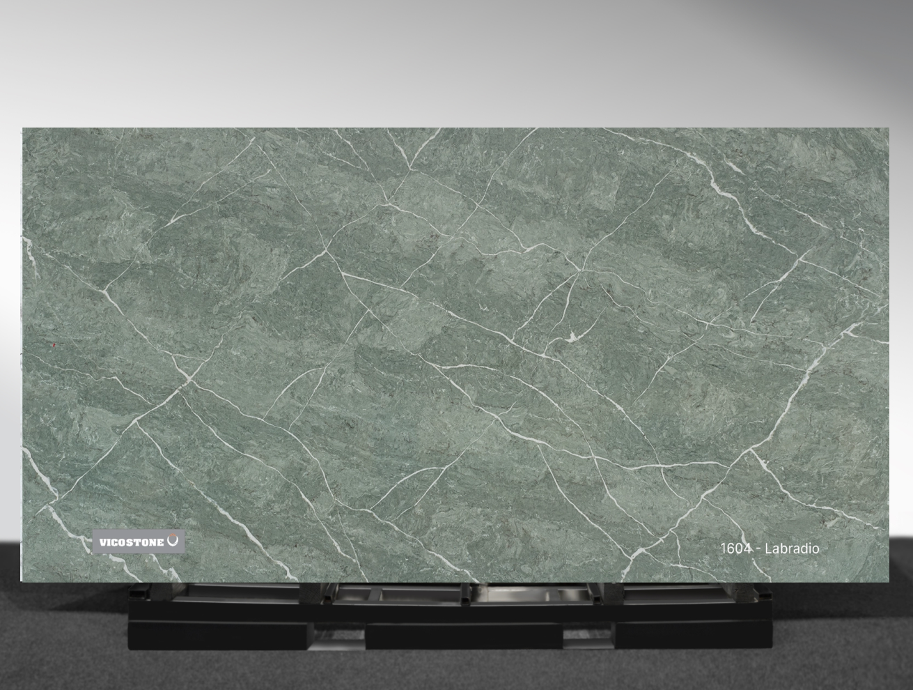 The Vicostone Labradio 1604 Quartz Slab, supplied by AUSK Stone, is inspired by the magical interplay of sunlight filtering through forest leaves. Featuring a soft green-gray base with delicate white, tree-like veining, Labradio 1604 captures the harmony of light and shadow in nature, creating a serene yet visually captivating surface.